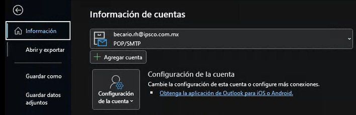 - En el Ordenador 1 abre Outlook presiona en la esquina superior izquierda en el botón «Archivo«, se desplegará el siguiente menú: