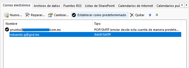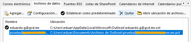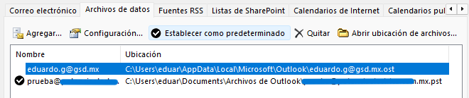 Selecciona la cuenta que se va quedar en el ordenador 1 y presiona «Establecer como predeterminado«, ahora esta cuenta debería aparecer palomeada. - Luego, en la parte superior de esta ventana cambia a la pestaña «Archivo de datos«: